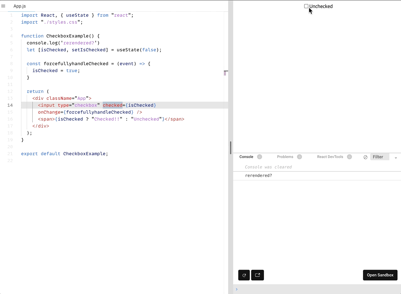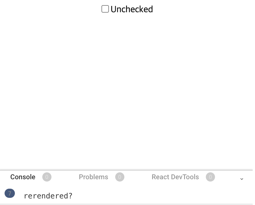 체크박스를 누를 때마다 콘솔에 "rerendered?" 가 찍힌다. 즉, 컴포넌트의 상태가 변경될 때마다 새롭게 호출되고, 리렌더링 된다.