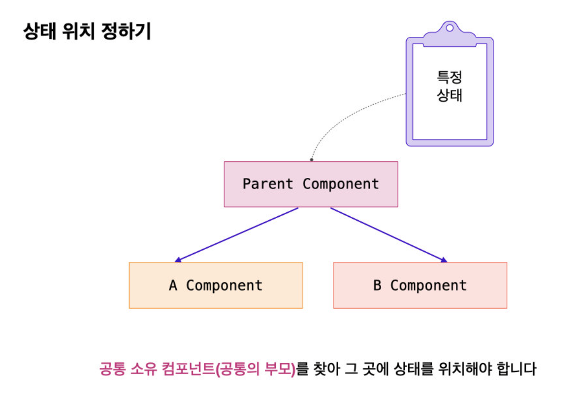 두 개의 자식 컴포넌트가 하나의 상태에 접근하고자 할 때는 두 자식의 공통 부모 컴포넌트에 상태를 위치해야 한다.