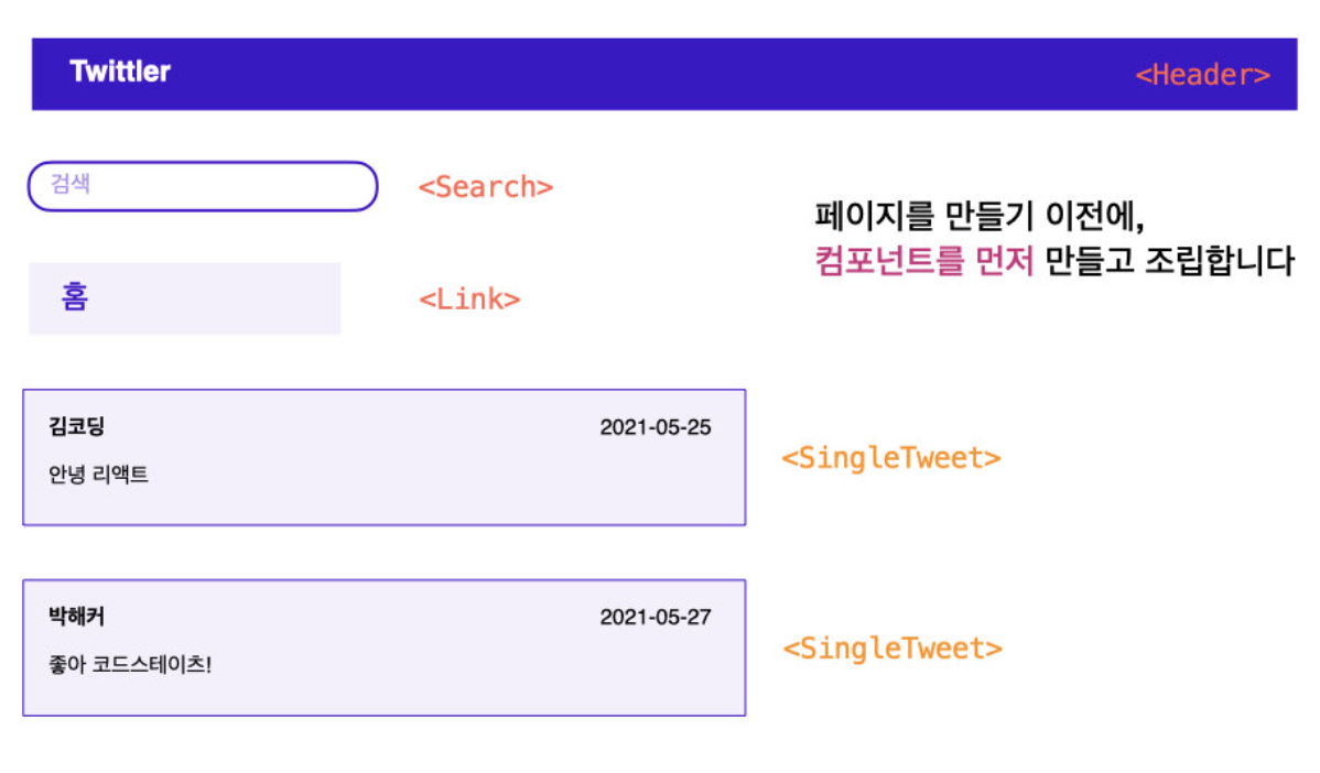 프로토타입에서 그림과 같이 컴포넌트를 찾아냈다. 이렇게 먼저 컴포넌트를 만들고, 다시 페이지를 조립해나간다.