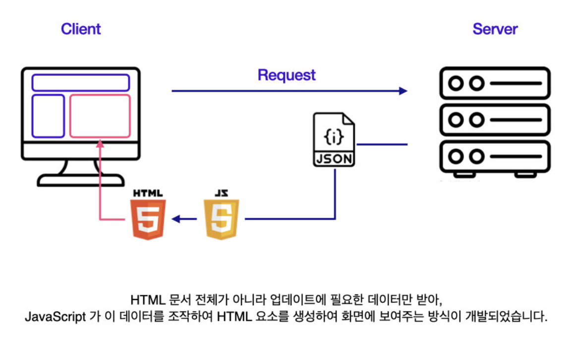 1990년대 후반에 HTML 문서 전체가 아닌, 업데이트에 필요한 데이터만 서버에서 전달받아 이 데이터를 JavaScript가 동적으로 HTML 요소를 생성해서 화면에 보여주는 방식이 개발되어 사용되기 시작하였다. 2000년대 중반부터 이러한 개발 방식을 이용한 웹 애플리케이션이 보편화되었으며, 이것이 우리가 지금 배우고 있는 싱글 페이지 애플리케이션, 즉 SPA이다.
