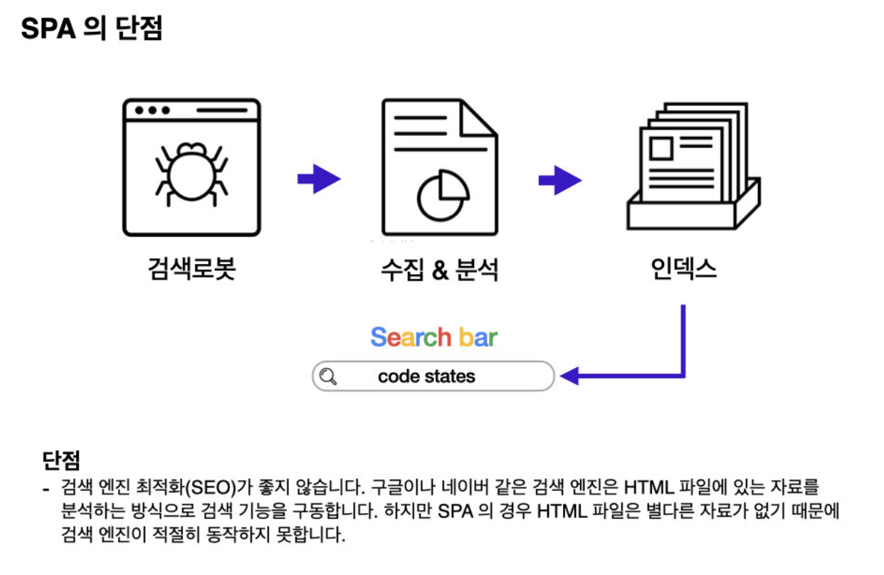 검색 로봇은 자료를 수집할 때에 웹 페이지의 URL은 물론이고 HTML 문서 내의 각종 태그나 링크 등을 분석한다. SPA는 HTML이 거의 비어있다 보니 검색 로봇이 충분한 자료를 수집하지 못한다. 이 때문에 검색 노출이 중요한 웹 애플리케이션은 검색 엔진 최적화에 대한 대응책을 따로 마련해야 하고, 더불어 앱 안에서 브라우저의 앞으로 가기/뒤로 가기 등의 상태 관리도 해야 하기 때문에 개발의 복잡도가 더욱 늘어난다. 다만 SPA에서도 검색 엔진 최적화에 대응할 수 있도록 검색 엔진이 발전하고 있어서, 점차 이 단점은 사라지고 있는 추세이다.