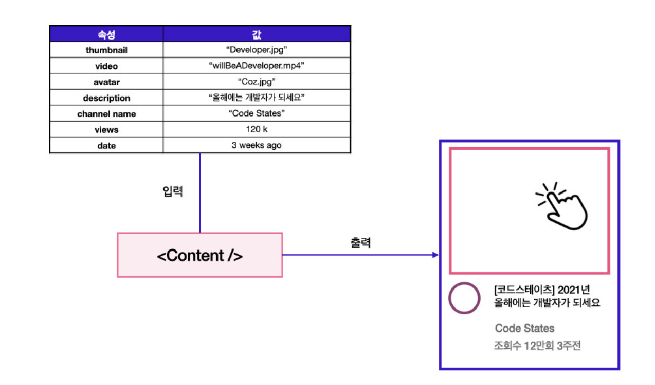 Content 컴포넌트는 영상과 관련된 데이터를 입력받아, UI에 맞게 화면에 출력해준다. 더불어 눈에 보이지는 않지만 클릭 시 해당 영상을 재생해 주는 기능도 가지고 있다.
